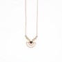 Γεωμετρία και λάμψη, ένα μενταγιόν από ροζ χρυσό σε δεκατέσσερα καράτια (14 κ). Η αλυσίδα του έχει μήκος σαράντα εκατοστά. Στο τελείωμα της έχει μικρούς στρογγυλούς κρίκους για να κλείνει σε όποιο μήκος θες. Το κύριο μοτίβο του μενταγιόν είναι ένα ημικύκλιο που στο κέντρο του υπάρχει ένας μικρός κύκλος, ο οποίος είναι διακοσμημένος με μαύρα ζιργκόν. Δεξιά και αριστερά του κύκλου βρίσκονται τρία διακριτικά παραλληλόγραμμα διακοσμημένα με λευκές πέτρες ζιργκόν.