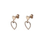 Sweet hearts earrings σκουλαρίκια από ροζ χρυσό σε εννιά καράτια (9κ).Αποτελείται από δύο μέρη.Στο πάνω μέρος είναι μια καρδιά συμπαγής με ένα λεπτό περίγραμμα από μαύρο πλατίνωμα.Εκεί βρίσκεται και το κούμπωμα καρφάκι(αυτό που πέρνάει μέσα στο αυτί).Στο κάτω μέρος βρίσκεται μια διάτρητη καρδιά(δηλαδή είναι κενή στο μέσο)με ένα λεπτό μαύρο περίγραμμα και πάλι.Το συνολικό μήκος του σκουλαρικιού είναι δύο εκατοστά (2cm).